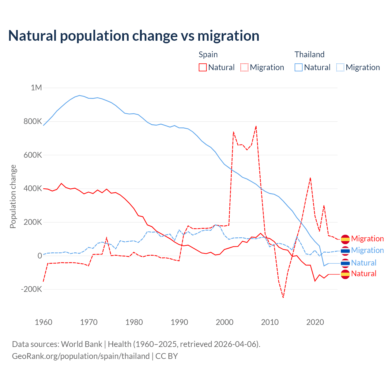 Over the last 10 years, 25.8% of the population change in Spain is from natural causes (a loss of 627,829 people) and 74.2% is from migration (a gain of 1,810,127 people). In Thailand 78.4% is from natural causes (a gain of 1,292,528 people) and 21.6% is from migration (a gain of 355,361 people).