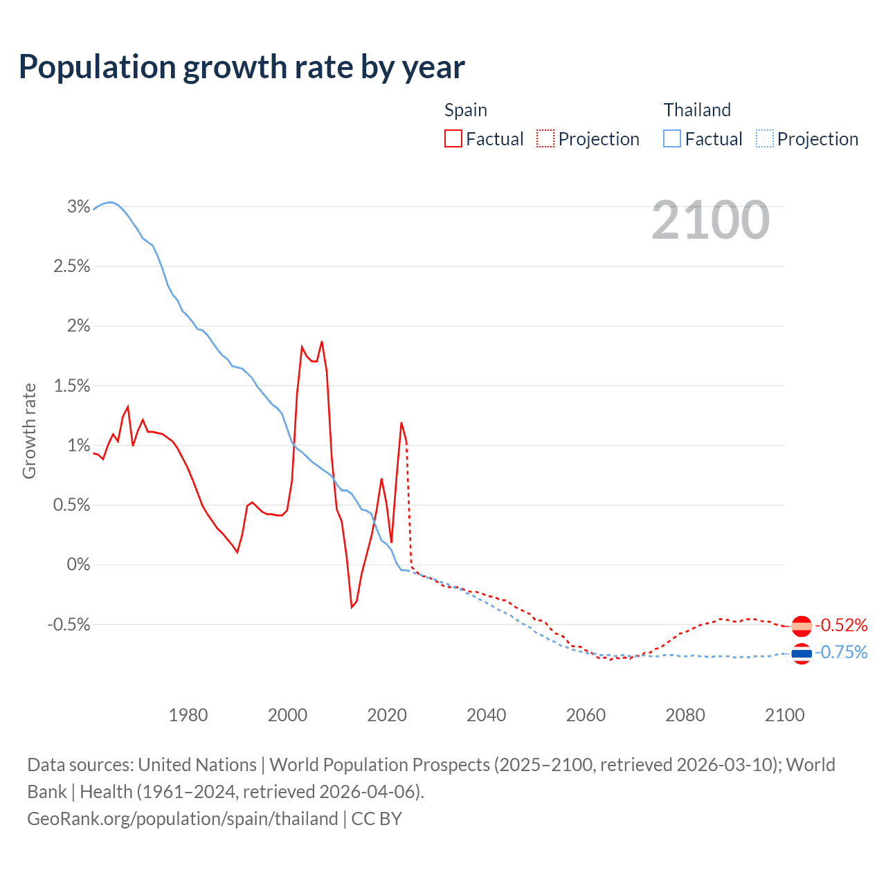 - For the last 10 years, Spain has had an average growth rate of +0.43% per year vs +0.23% in Thailand.