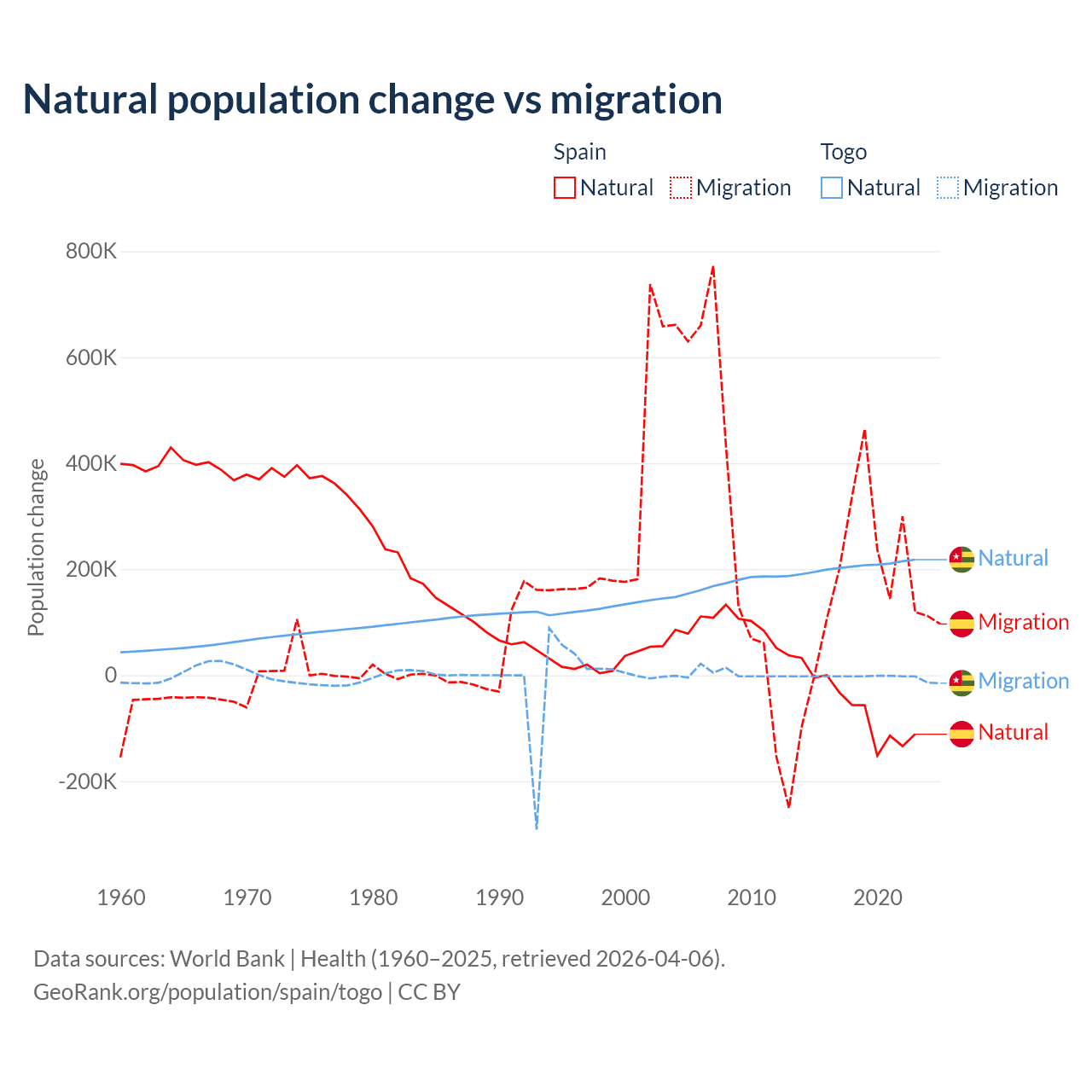 Over the last 10 years, 25.8% of the population change in Spain is from natural causes (a loss of 627,829 people) and 74.2% is from migration (a gain of 1,810,127 people). In Togo 99.1% is from natural causes (a gain of 2,052,115 people) and 0.86% is from migration (a loss of 17,852 people).