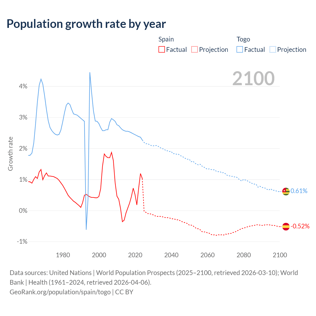 - For the last 10 years, Spain has had an average growth rate of +0.43% per year vs +2.46% in Togo.