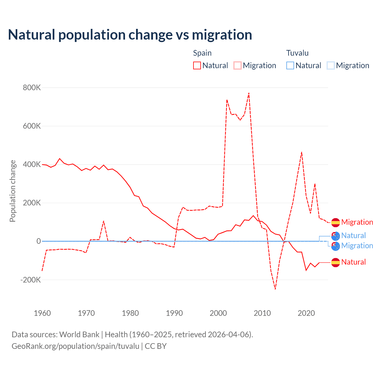 Over the last 10 years, 25.8% of the population change in Spain is from natural causes (a loss of 627,829 people) and 74.2% is from migration (a gain of 1,810,127 people). In Tuvalu 35.5% is from natural causes (a gain of 1,556 people) and 64.5% is from migration (a loss of 2,827 people).