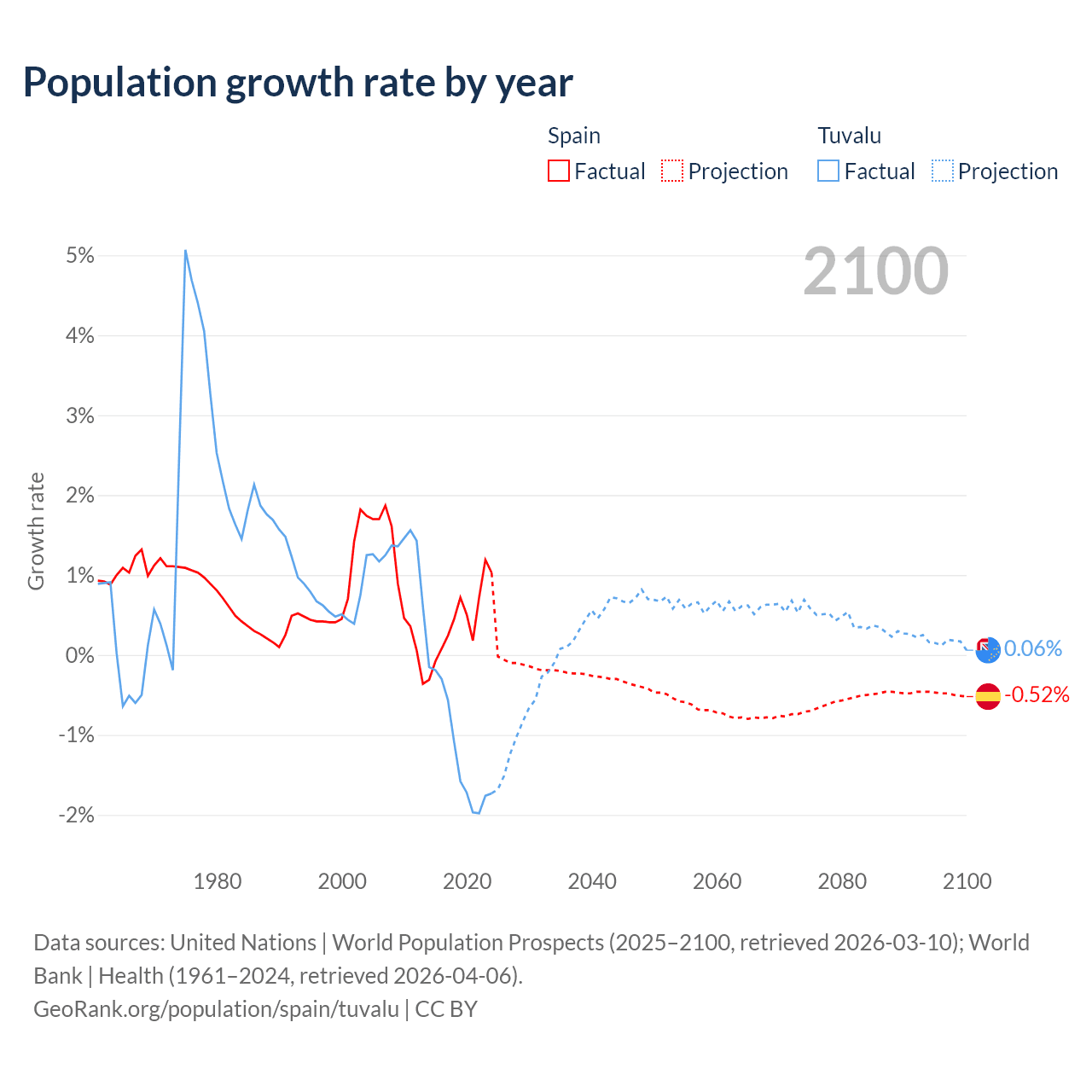 - For the last 10 years, Spain has had an average growth rate of +0.43% per year vs -1.19% in Tuvalu.