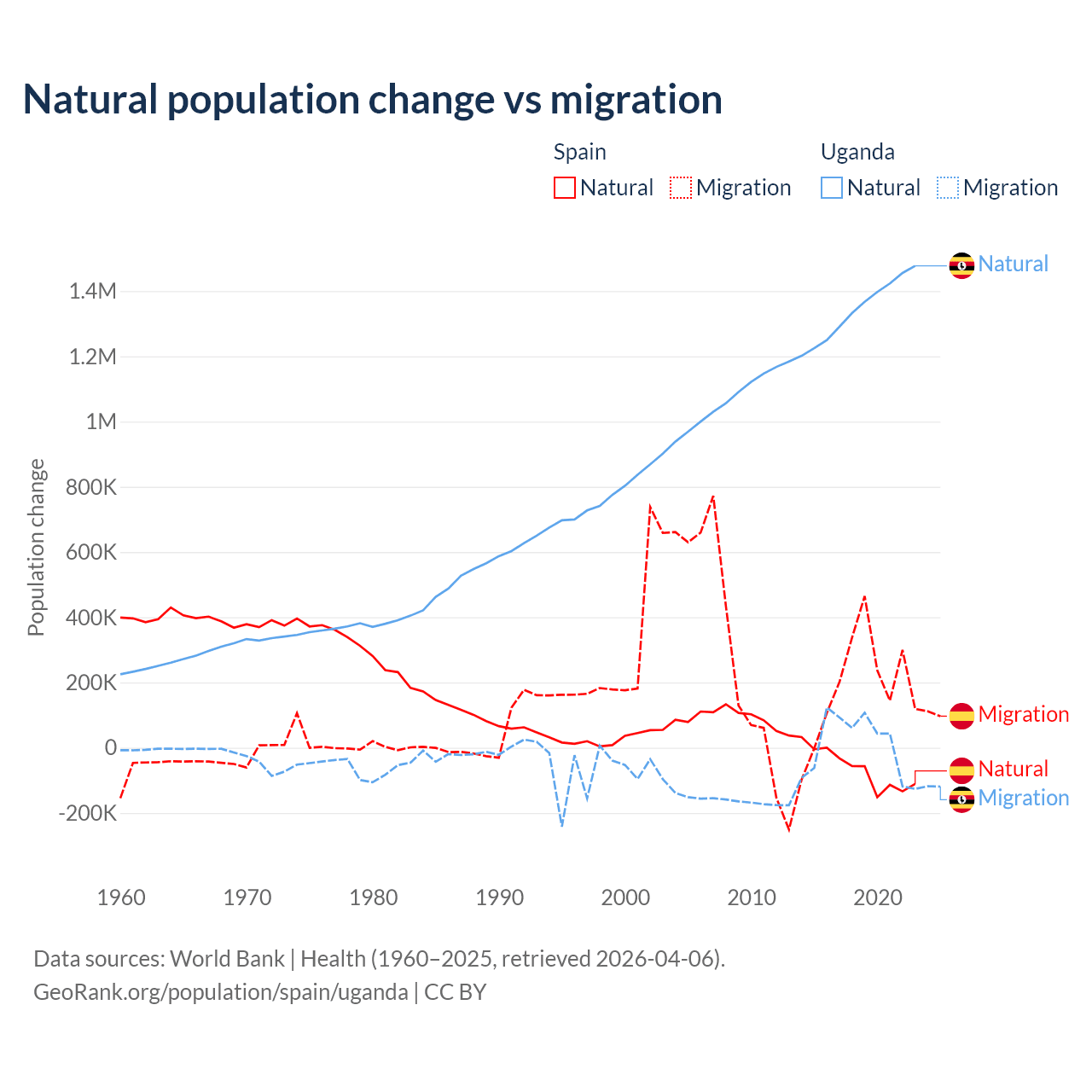 Over the last 10 years, 25.8% of the population change in Spain is from natural causes (a loss of 627,829 people) and 74.2% is from migration (a gain of 1,810,127 people). In Uganda 99.5% is from natural causes (a gain of 13,419,712 people) and 0.53% is from migration (a gain of 71,457 people).