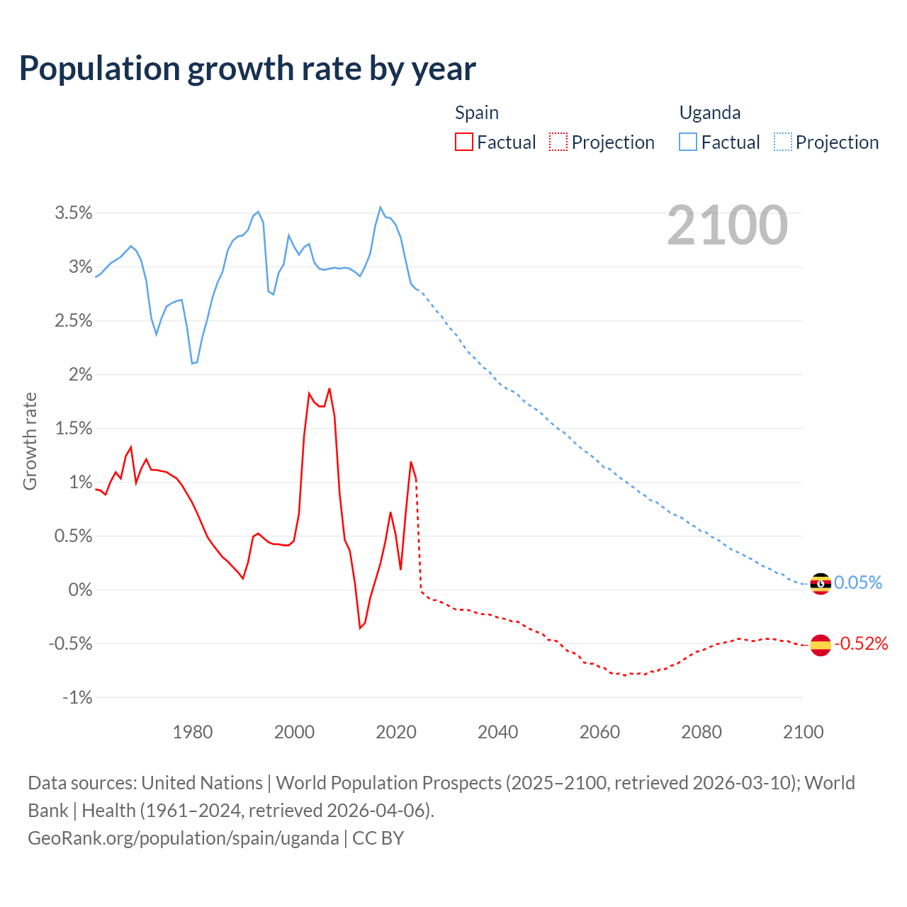 - For the last 10 years, Spain has had an average growth rate of +0.43% per year vs +3.21% in Uganda.