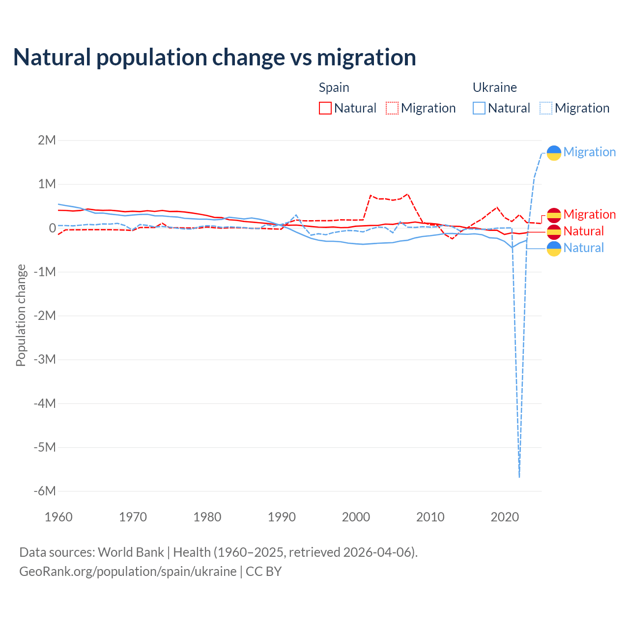 Over the last 10 years, 25.8% of the population change in Spain is from natural causes (a loss of 627,829 people) and 74.2% is from migration (a gain of 1,810,127 people). In Ukraine 28.2% is from natural causes (a loss of 2,435,153 people) and 71.8% is from migration (a loss of 6,198,995 people).