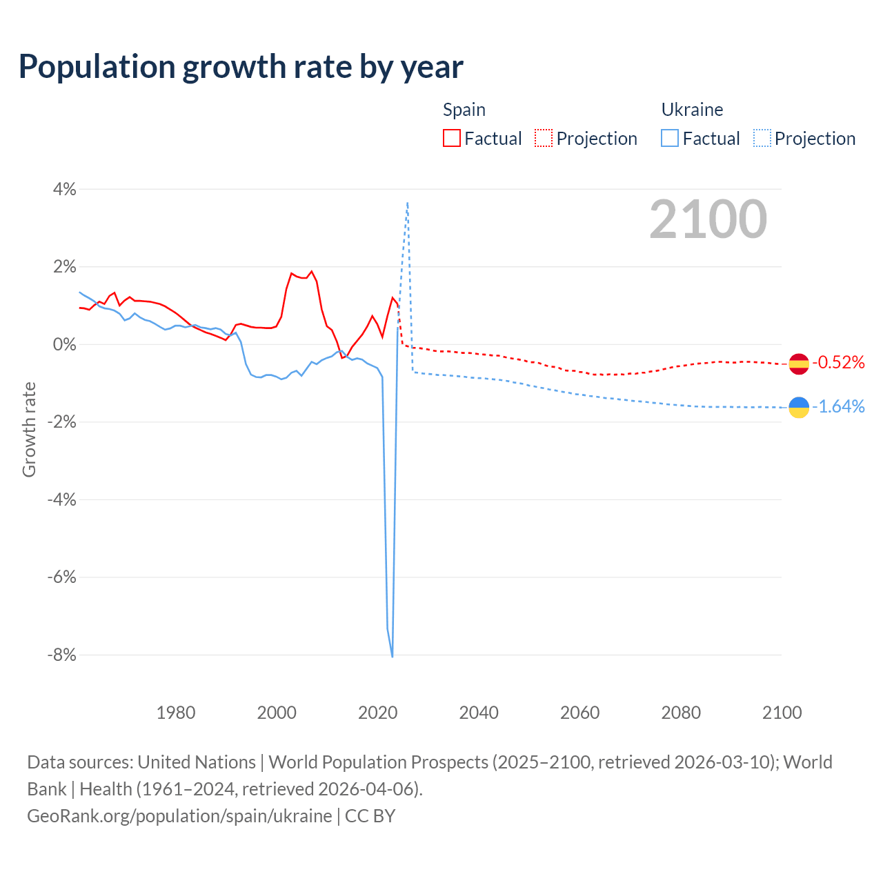 - For the last 10 years, Spain has had an average growth rate of +0.43% per year vs -1.74% in Ukraine.