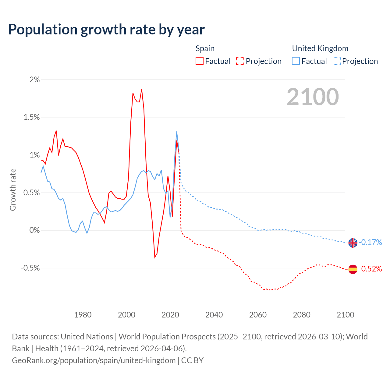 - For the last 10 years, Spain has had an average growth rate of +0.43% per year vs +0.7% in the United Kingdom.