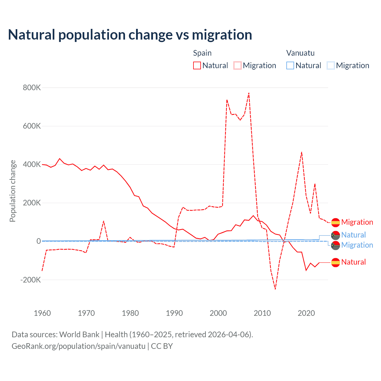 Over the last 10 years, 25.8% of the population change in Spain is from natural causes (a loss of 627,829 people) and 74.2% is from migration (a gain of 1,810,127 people). In Vanuatu 92.2% is from natural causes (a gain of 72,941 people) and 7.81% is from migration (a loss of 6,181 people).