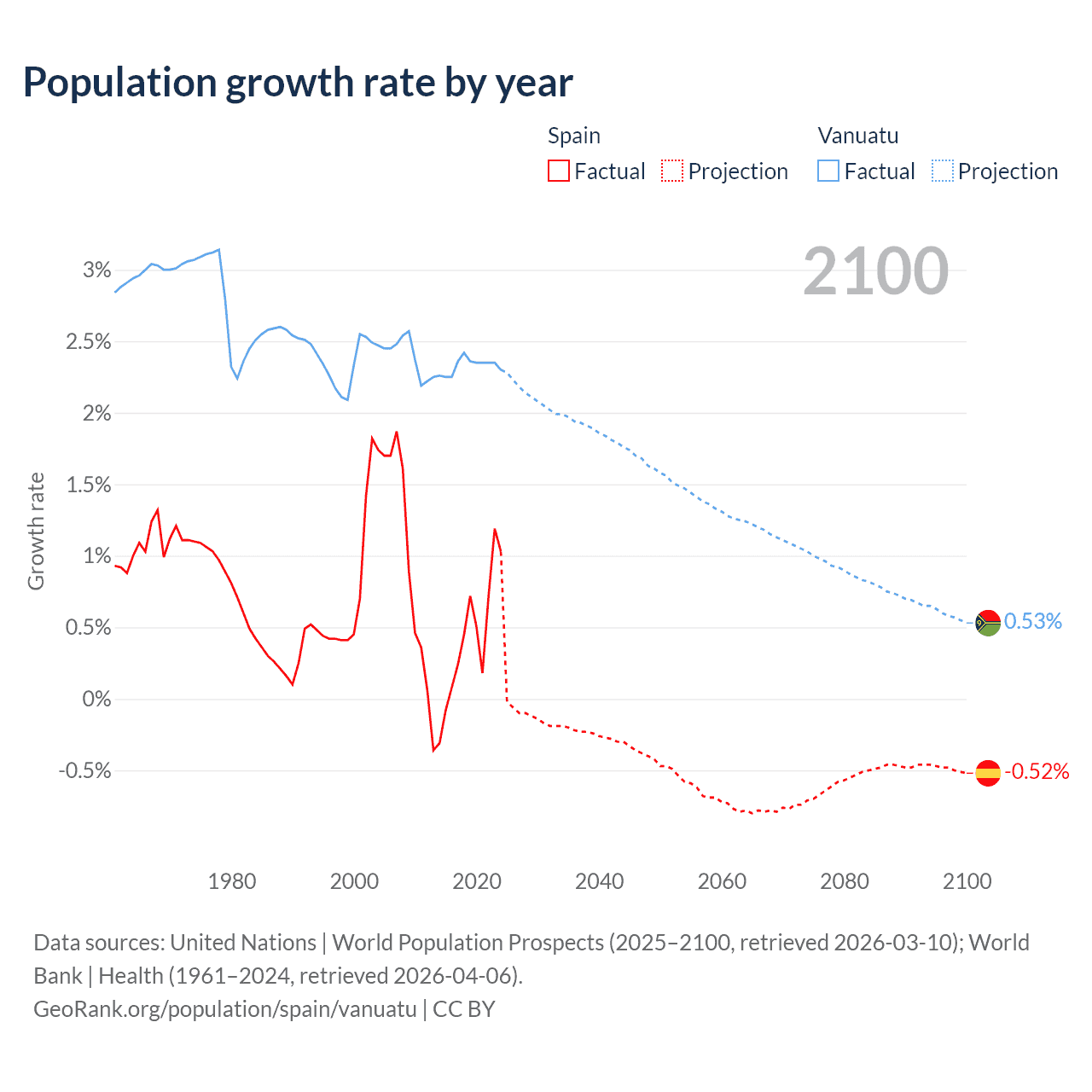- For the last 10 years, Spain has had an average growth rate of +0.43% per year vs +2.33% in Vanuatu.
