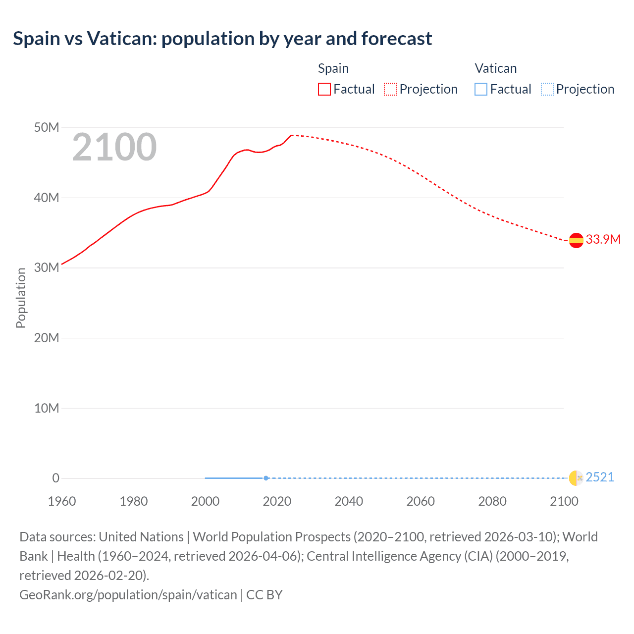 The latest officially reported population of Spain was 48,848,840 in 2024 vs 1,000 people in the Vatican in 2019. In 2026, based on the adjusted UN estimation, the current Spain's population is 48,806,901 people compared to 936 in the Vatican.