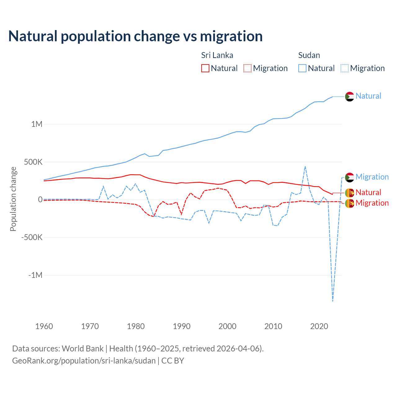 Over the last 10 years, 85.3% of the population change in Sri Lanka is from natural causes (a gain of 1,605,749 people) and 14.7% is from migration (a loss of 276,121 people). In Sudan 95.1% is from natural causes (a gain of 12,459,977 people) and 4.88% is from migration (a loss of 639,596 people).