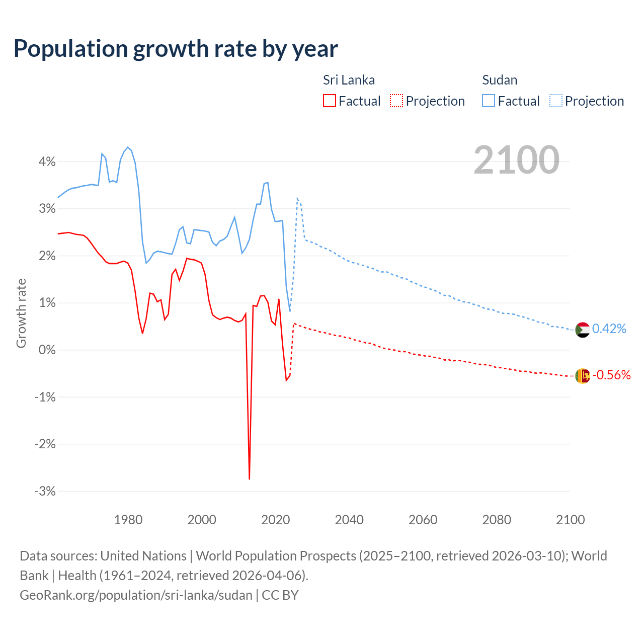 - For the last 10 years, Sri Lanka has had an average growth rate of +0.57% per year vs +2.67% in Sudan.