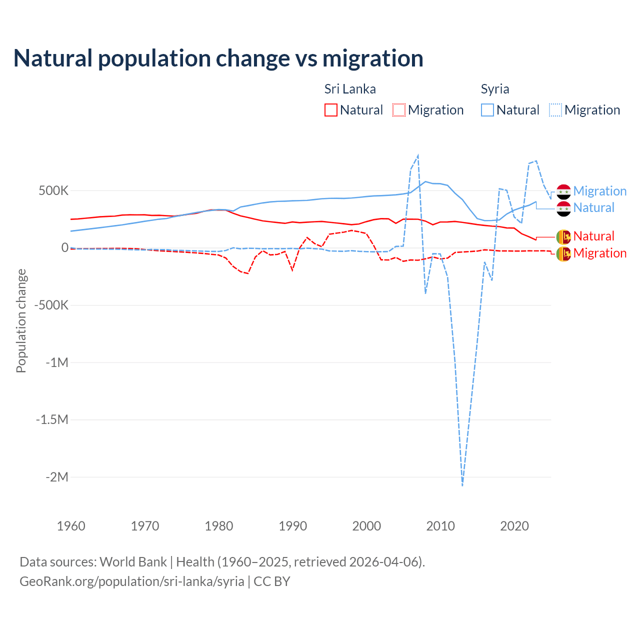 Over the last 10 years, 85.3% of the population change in Sri Lanka is from natural causes (a gain of 1,605,749 people) and 14.7% is from migration (a loss of 276,121 people). In Syria 91.3% is from natural causes (a gain of 3,047,621 people) and 8.72% is from migration (a gain of 291,069 people).