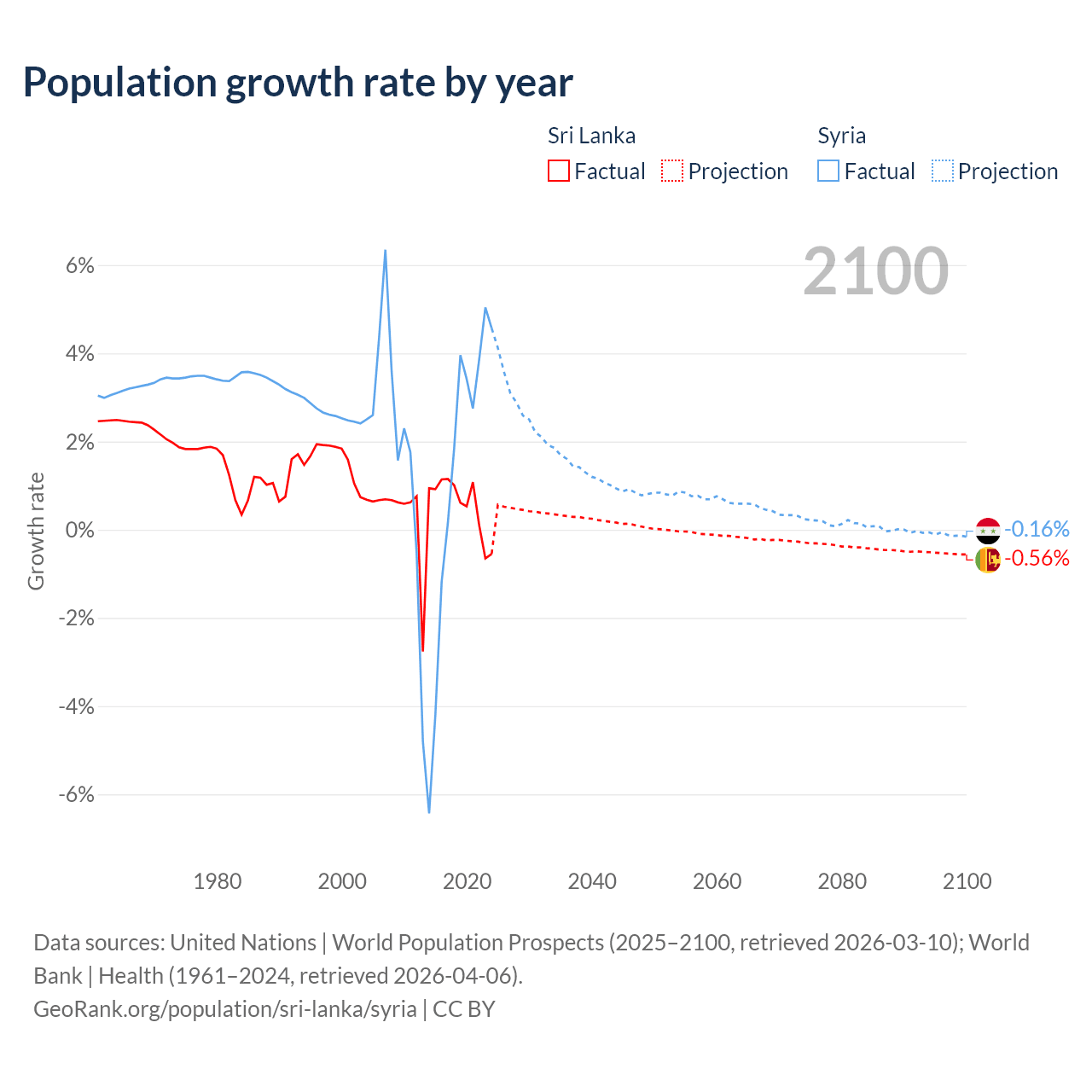 - For the last 10 years, Sri Lanka has had an average growth rate of +0.57% per year vs +1.25% in Syria.