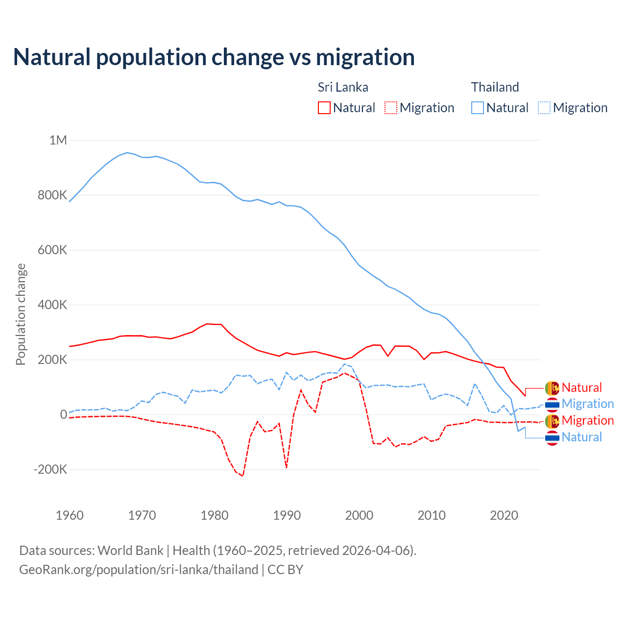 Over the last 10 years, 85.3% of the population change in Sri Lanka is from natural causes (a gain of 1,605,749 people) and 14.7% is from migration (a loss of 276,121 people). In Thailand 78.4% is from natural causes (a gain of 1,292,528 people) and 21.6% is from migration (a gain of 355,361 people).