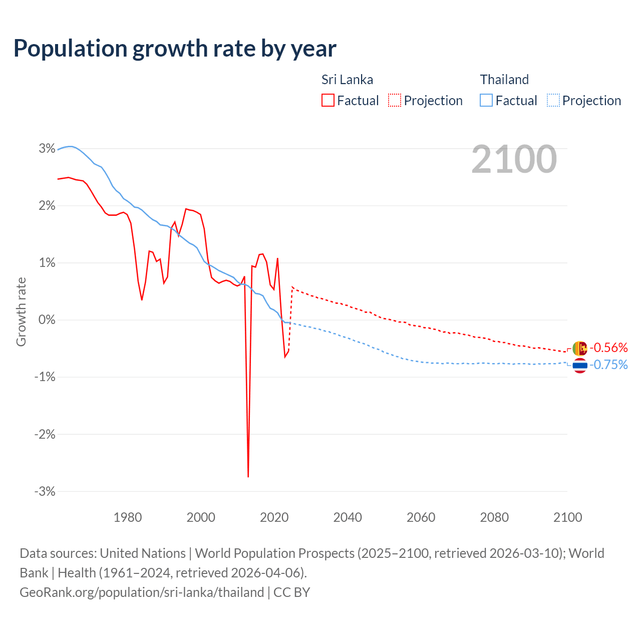 - For the last 10 years, Sri Lanka has had an average growth rate of +0.57% per year vs +0.23% in Thailand.