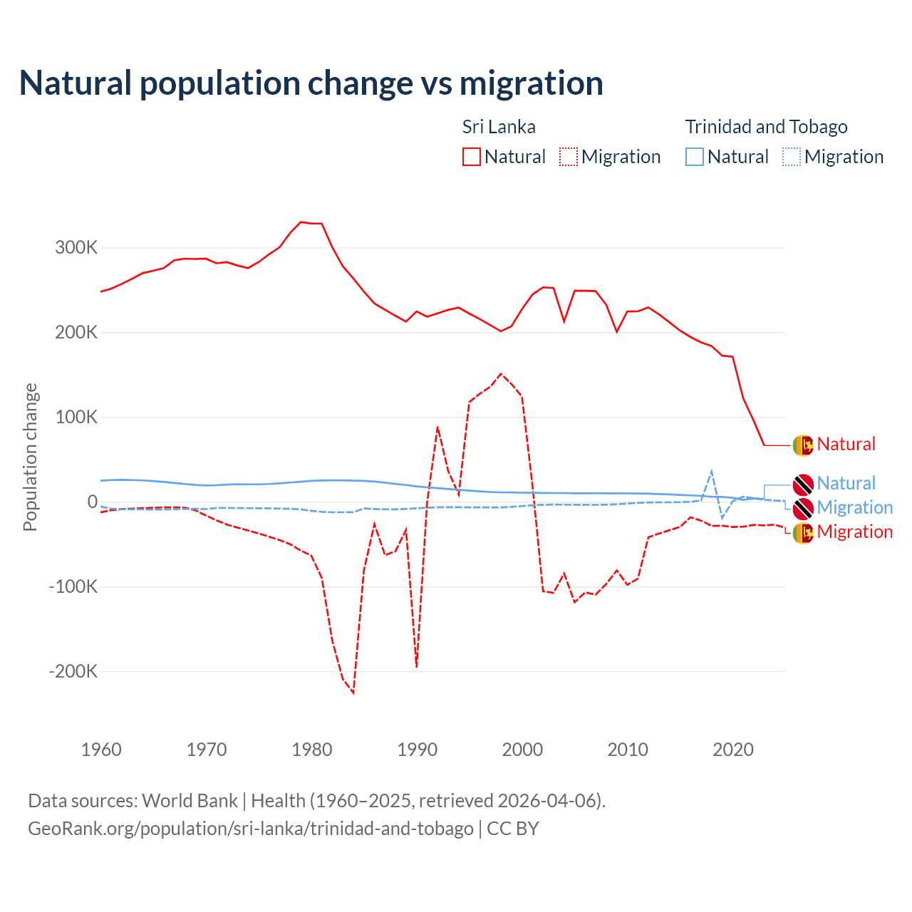 Over the last 10 years, 85.3% of the population change in Sri Lanka is from natural causes (a gain of 1,605,749 people) and 14.7% is from migration (a loss of 276,121 people). In Trinidad and Tobago 66% is from natural causes (a gain of 55,887 people) and 34% is from migration (a gain of 28,785 people).