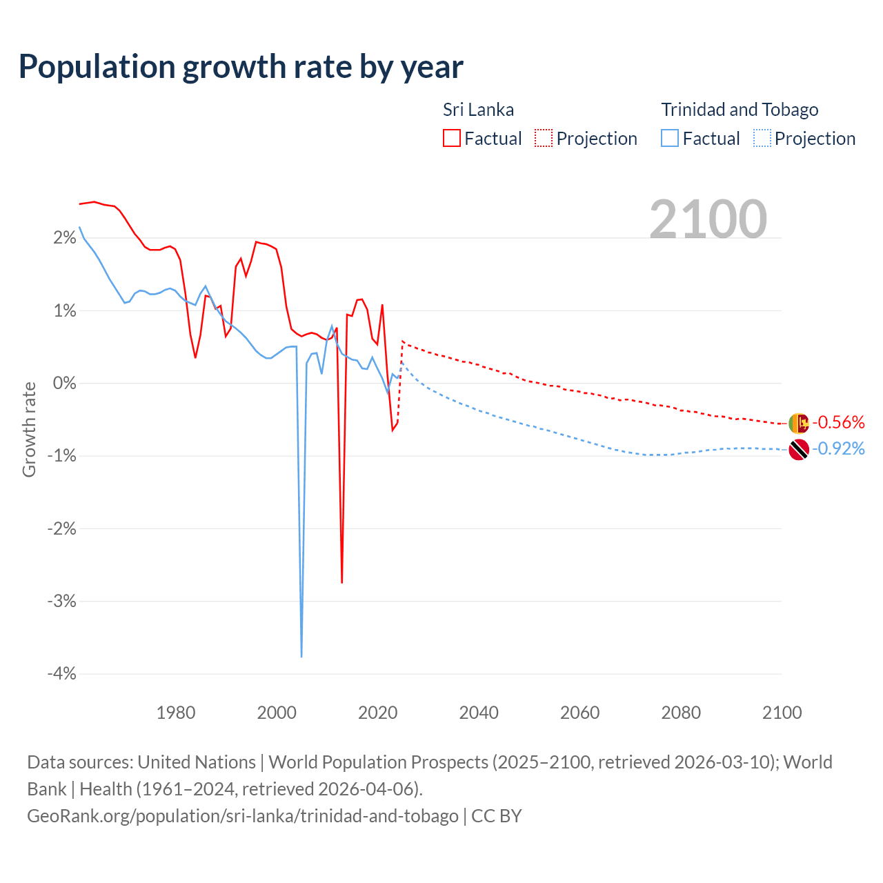 - For the last 10 years, Sri Lanka has had an average growth rate of +0.57% per year vs +0.19% in Trinidad and Tobago.