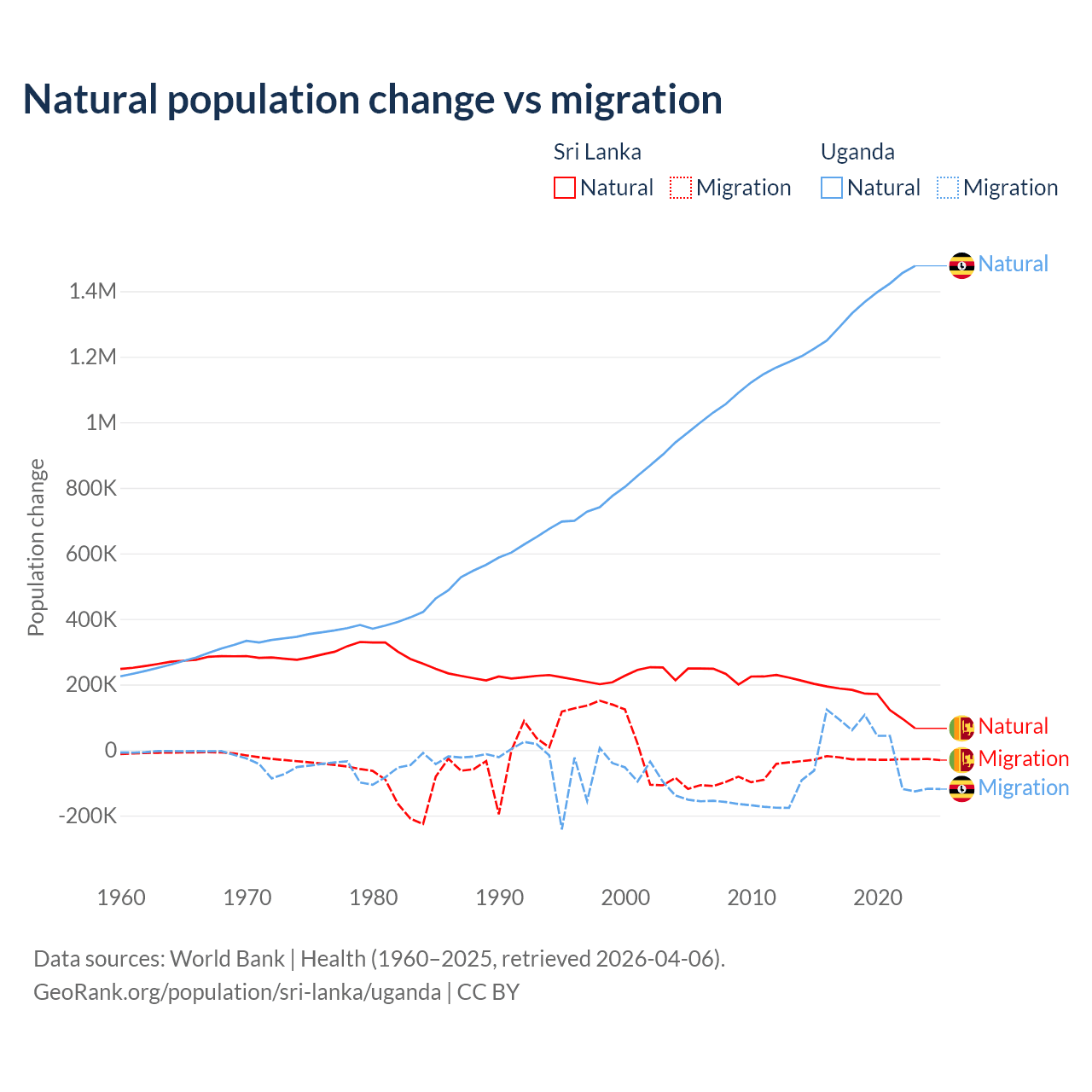 Over the last 10 years, 85.3% of the population change in Sri Lanka is from natural causes (a gain of 1,605,749 people) and 14.7% is from migration (a loss of 276,121 people). In Uganda 99.5% is from natural causes (a gain of 13,419,712 people) and 0.53% is from migration (a gain of 71,457 people).