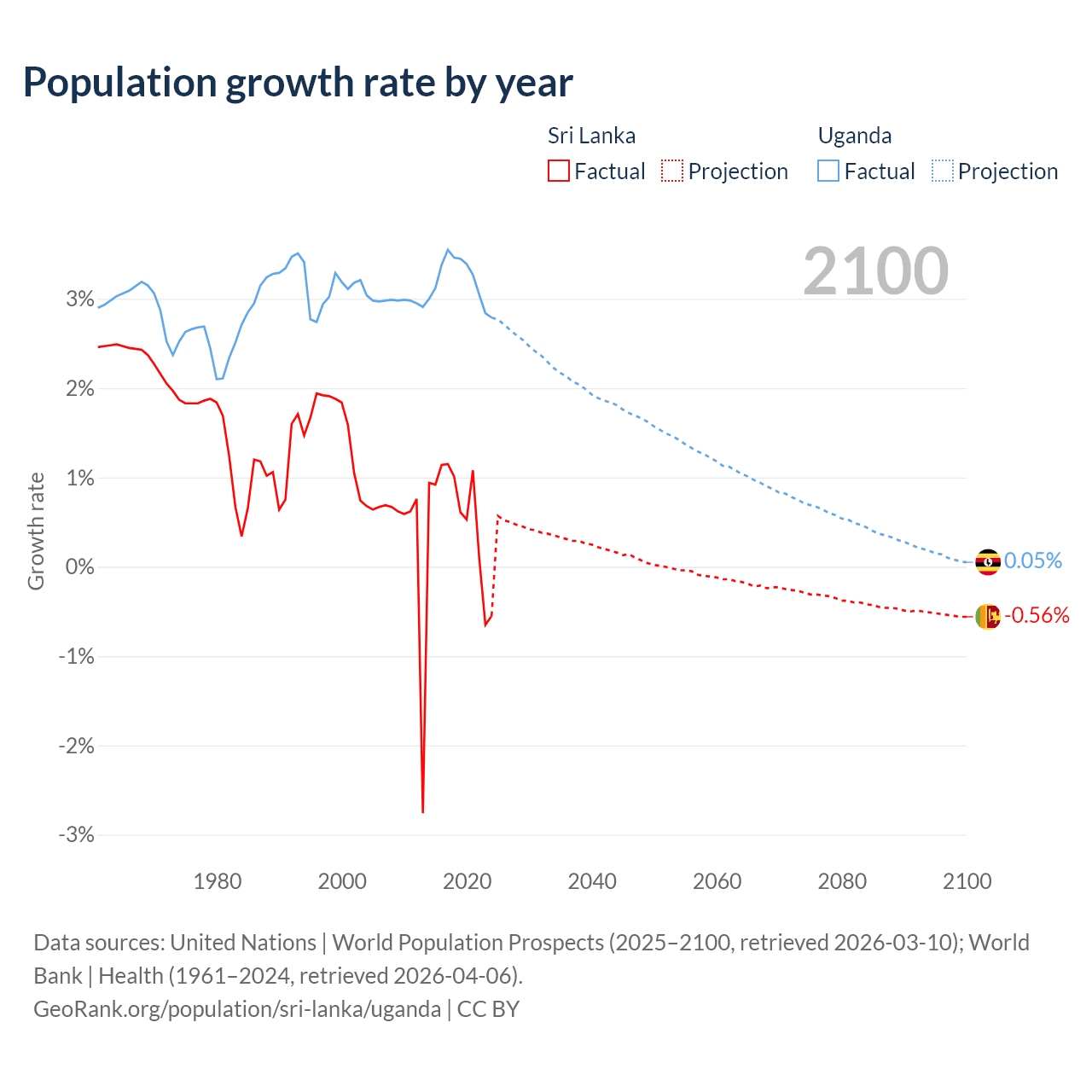 - For the last 10 years, Sri Lanka has had an average growth rate of +0.57% per year vs +3.21% in Uganda.