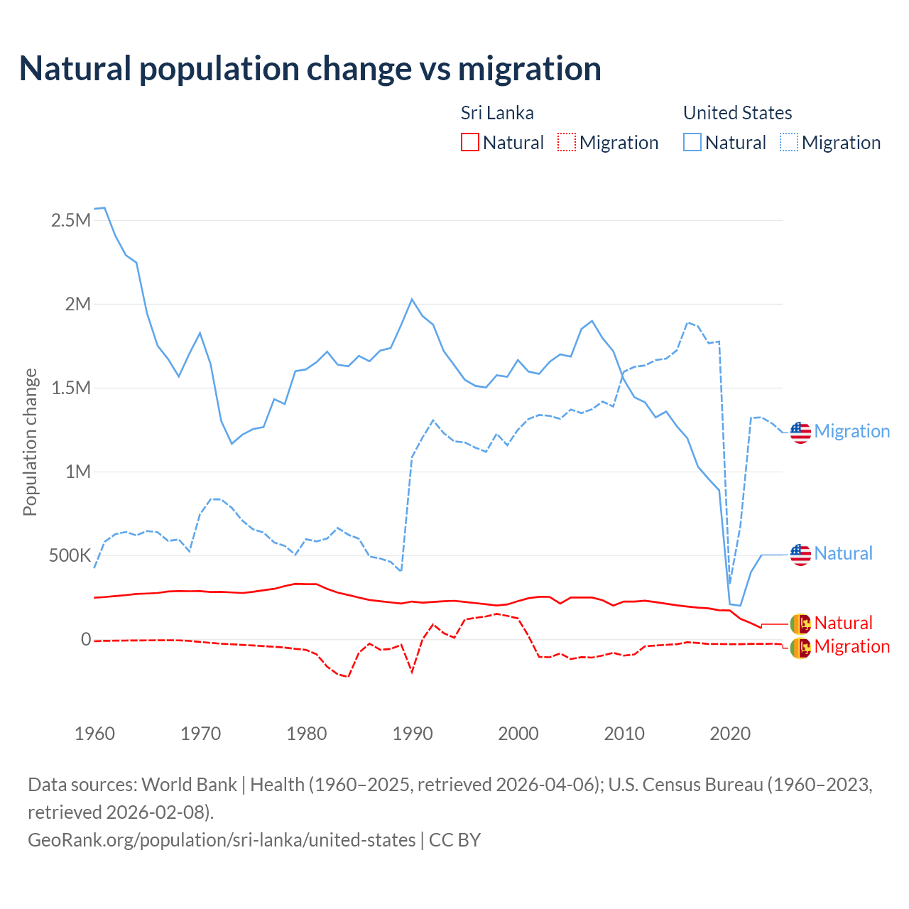 Over the last 10 years, 85.3% of the population change in Sri Lanka is from natural causes (a gain of 1,605,749 people) and 14.7% is from migration (a loss of 276,121 people). In the United States 35.8% is from natural causes (a gain of 8,005,866 people) and 64.2% is from migration (a gain of 14,334,286 people).