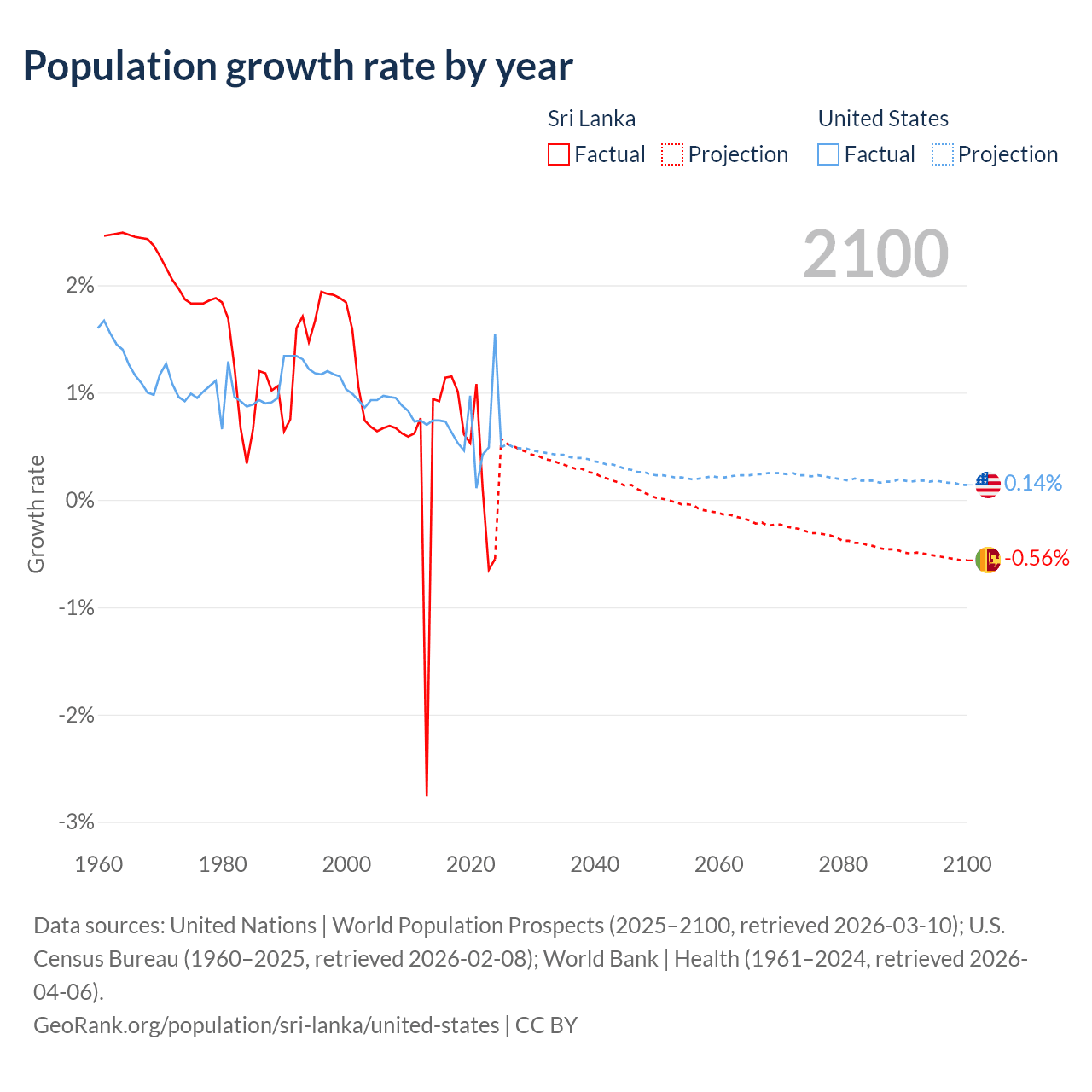 - For the last 10 years, Sri Lanka has had an average growth rate of +0.57% per year vs +0.65% in the United States.