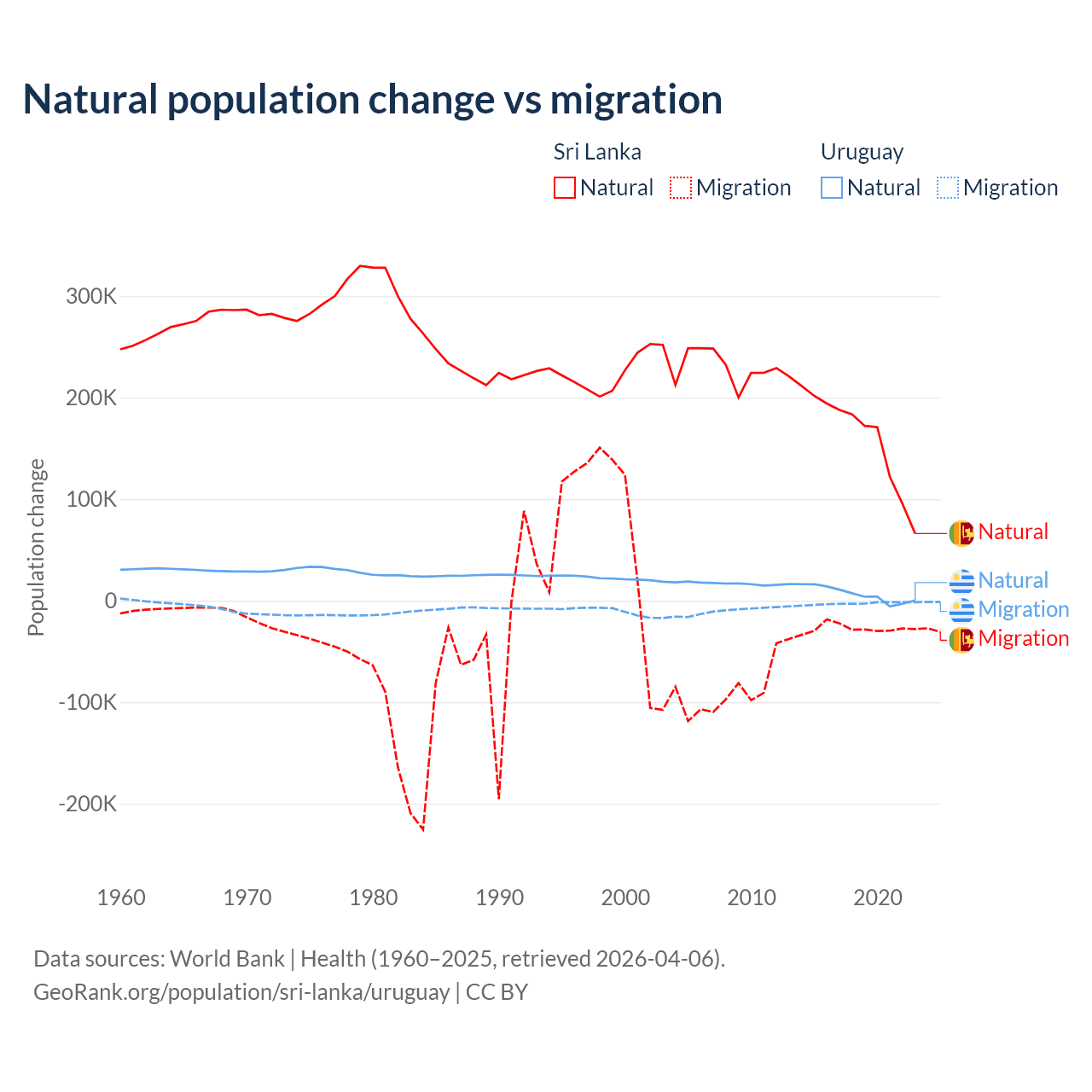 Over the last 10 years, 85.3% of the population change in Sri Lanka is from natural causes (a gain of 1,605,749 people) and 14.7% is from migration (a loss of 276,121 people). In Uruguay 70% is from natural causes (a gain of 64,303 people) and 30% is from migration (a loss of 27,501 people).