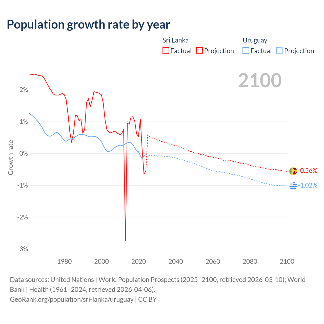 - For the last 10 years, Sri Lanka has had an average growth rate of +0.57% per year vs +0.11% in Uruguay.