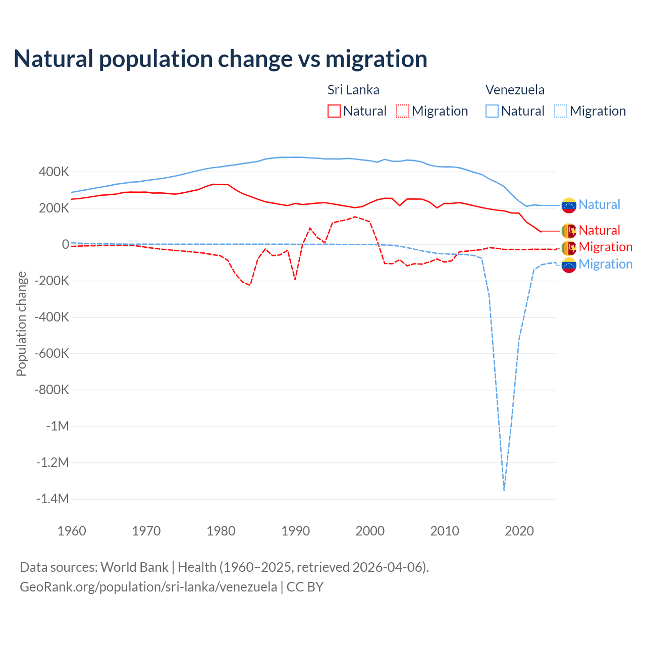 Over the last 10 years, 85.3% of the population change in Sri Lanka is from natural causes (a gain of 1,605,749 people) and 14.7% is from migration (a loss of 276,121 people). In Venezuela 38.6% is from natural causes (a gain of 2,946,257 people) and 61.4% is from migration (a loss of 4,683,227 people).