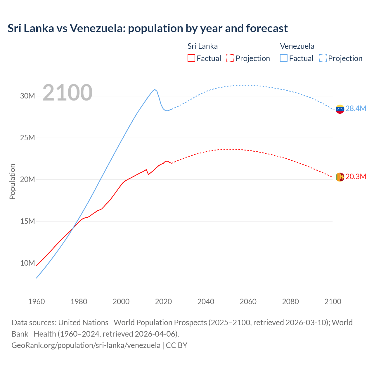 Sri Lanka vs Venezuela: population by year and forecast