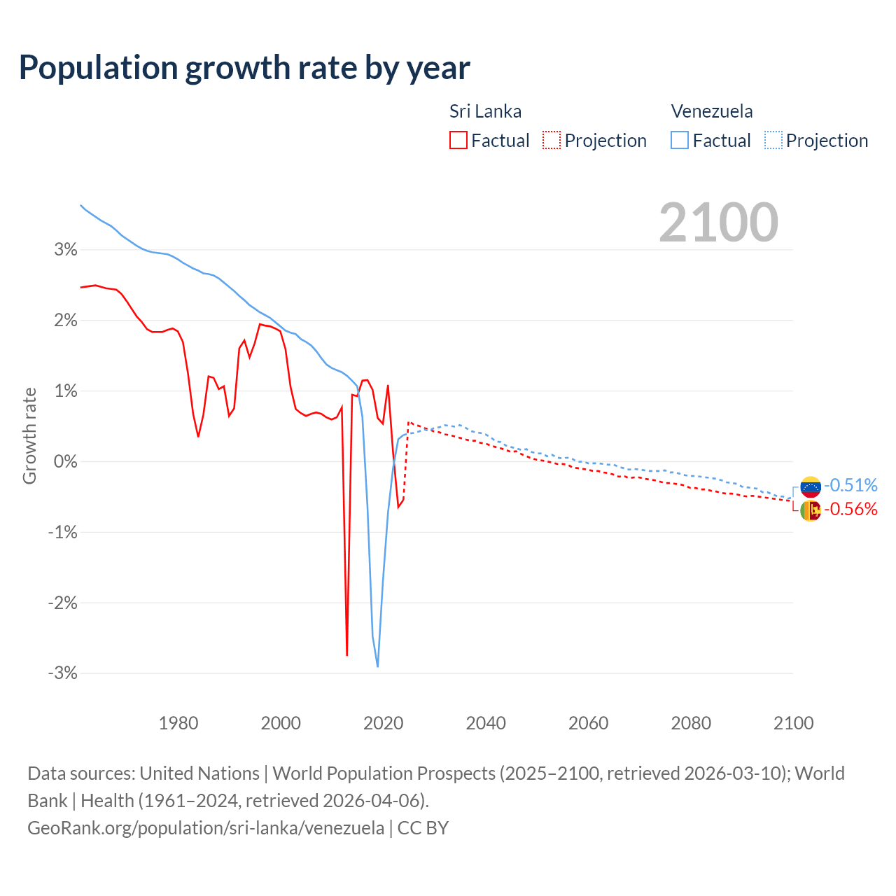 - For the last 10 years, Sri Lanka has had an average growth rate of +0.57% per year vs -0.46% in Venezuela.