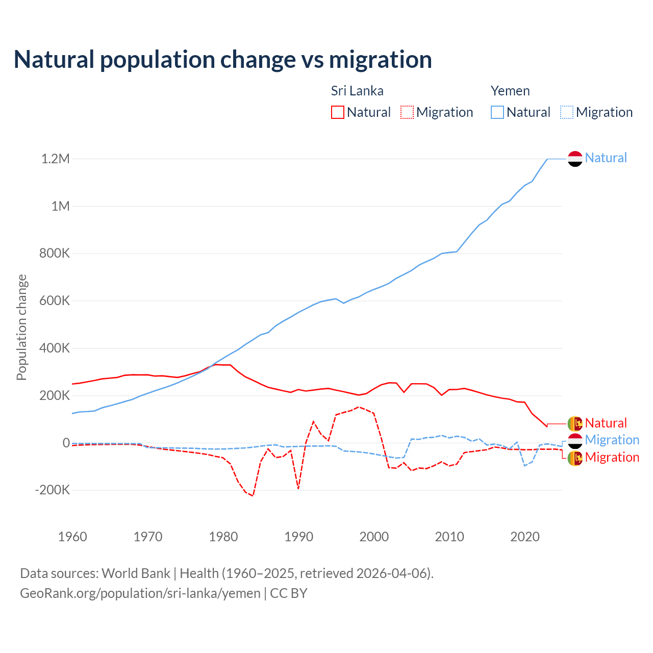 Over the last 10 years, 85.3% of the population change in Sri Lanka is from natural causes (a gain of 1,605,749 people) and 14.7% is from migration (a loss of 276,121 people). In Yemen 97.8% is from natural causes (a gain of 10,460,813 people) and 2.17% is from migration (a loss of 231,814 people).