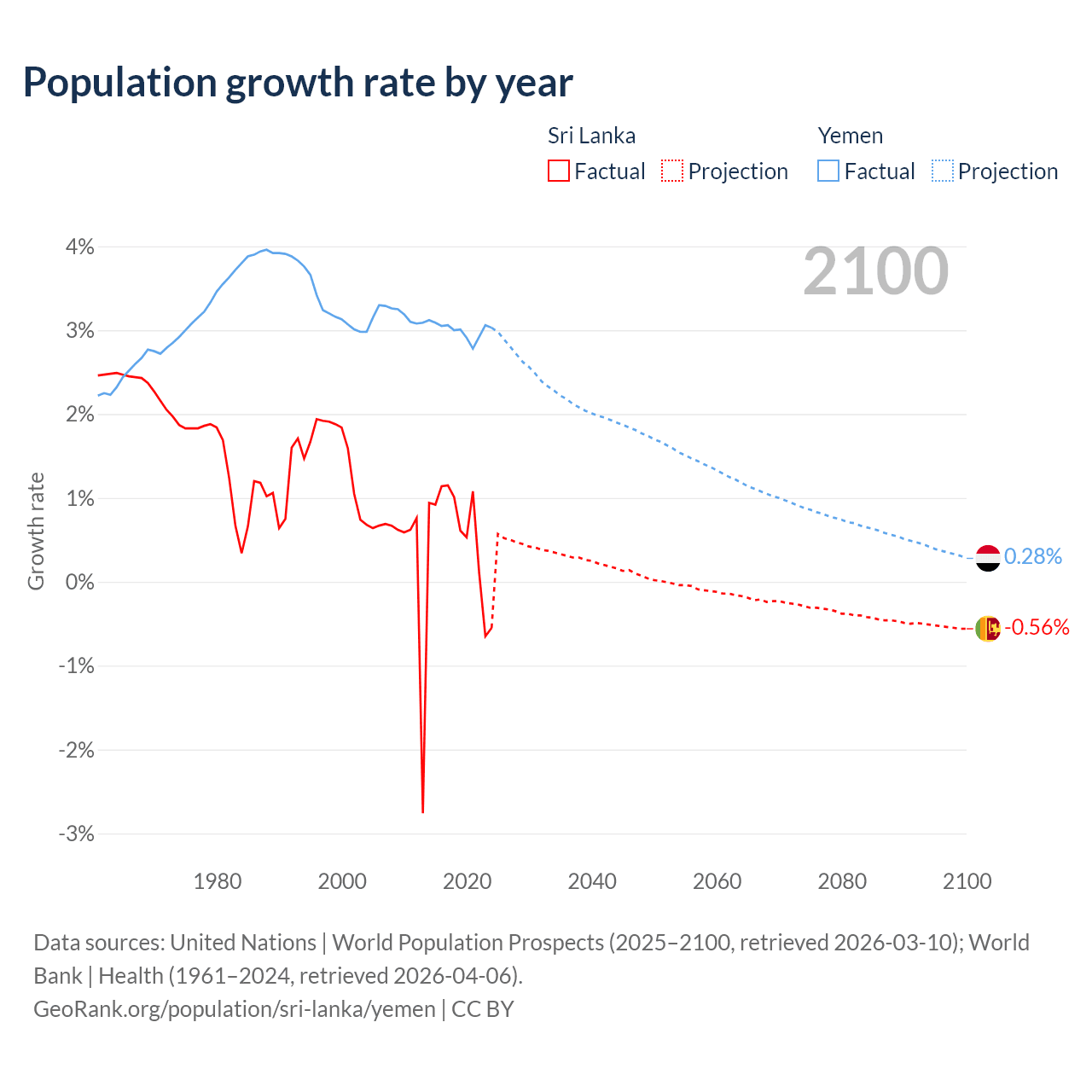 - For the last 10 years, Sri Lanka has had an average growth rate of +0.57% per year vs +3% in Yemen.