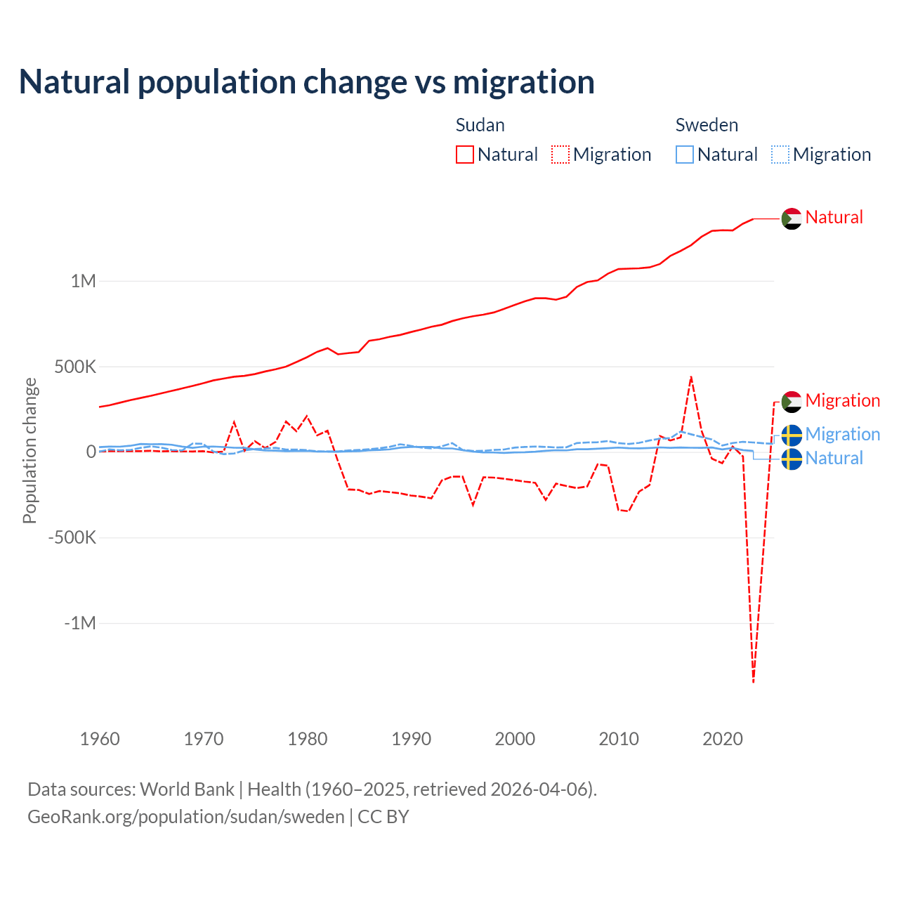 Over the last 10 years, 95.1% of the population change in Sudan is from natural causes (a gain of 12,459,977 people) and 4.88% is from migration (a loss of 639,596 people). In Sweden 21.4% is from natural causes (a gain of 201,900 people) and 78.6% is from migration (a gain of 743,642 people).