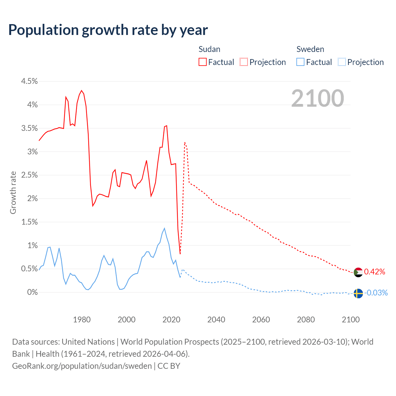 - For the last 10 years, Sudan has had an average growth rate of +2.67% per year vs +0.88% in Sweden.