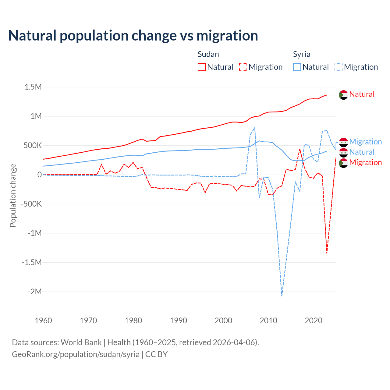 Over the last 10 years, 95.1% of the population change in Sudan is from natural causes (a gain of 12,459,977 people) and 4.88% is from migration (a loss of 639,596 people). In Syria 91.3% is from natural causes (a gain of 3,047,621 people) and 8.72% is from migration (a gain of 291,069 people).