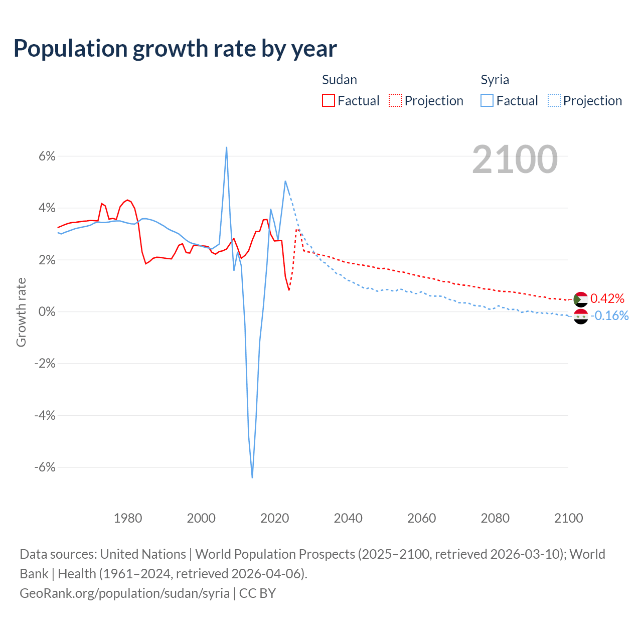 - For the last 10 years, Sudan has had an average growth rate of +2.67% per year vs +1.25% in Syria.
