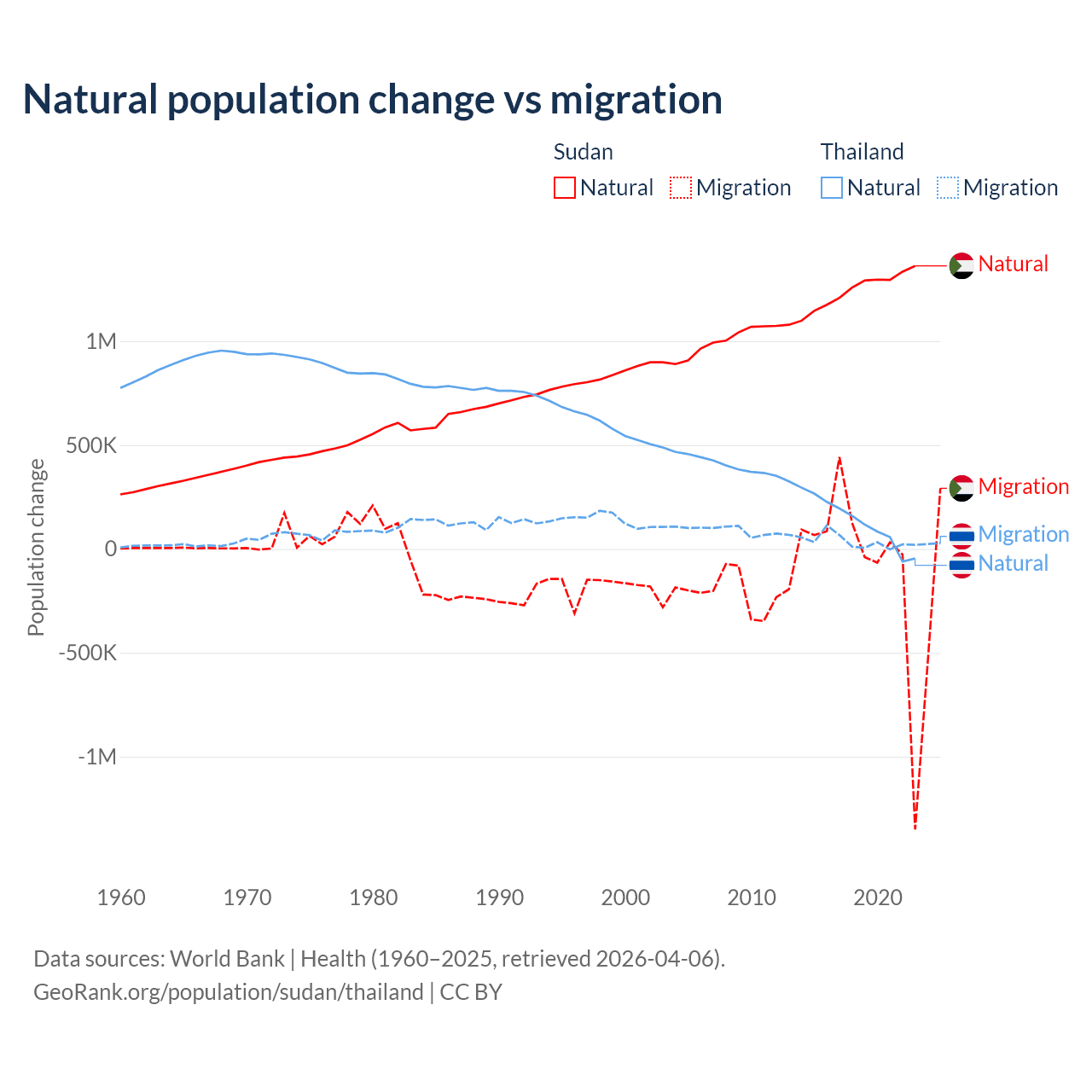 Over the last 10 years, 95.1% of the population change in Sudan is from natural causes (a gain of 12,459,977 people) and 4.88% is from migration (a loss of 639,596 people). In Thailand 78.4% is from natural causes (a gain of 1,292,528 people) and 21.6% is from migration (a gain of 355,361 people).