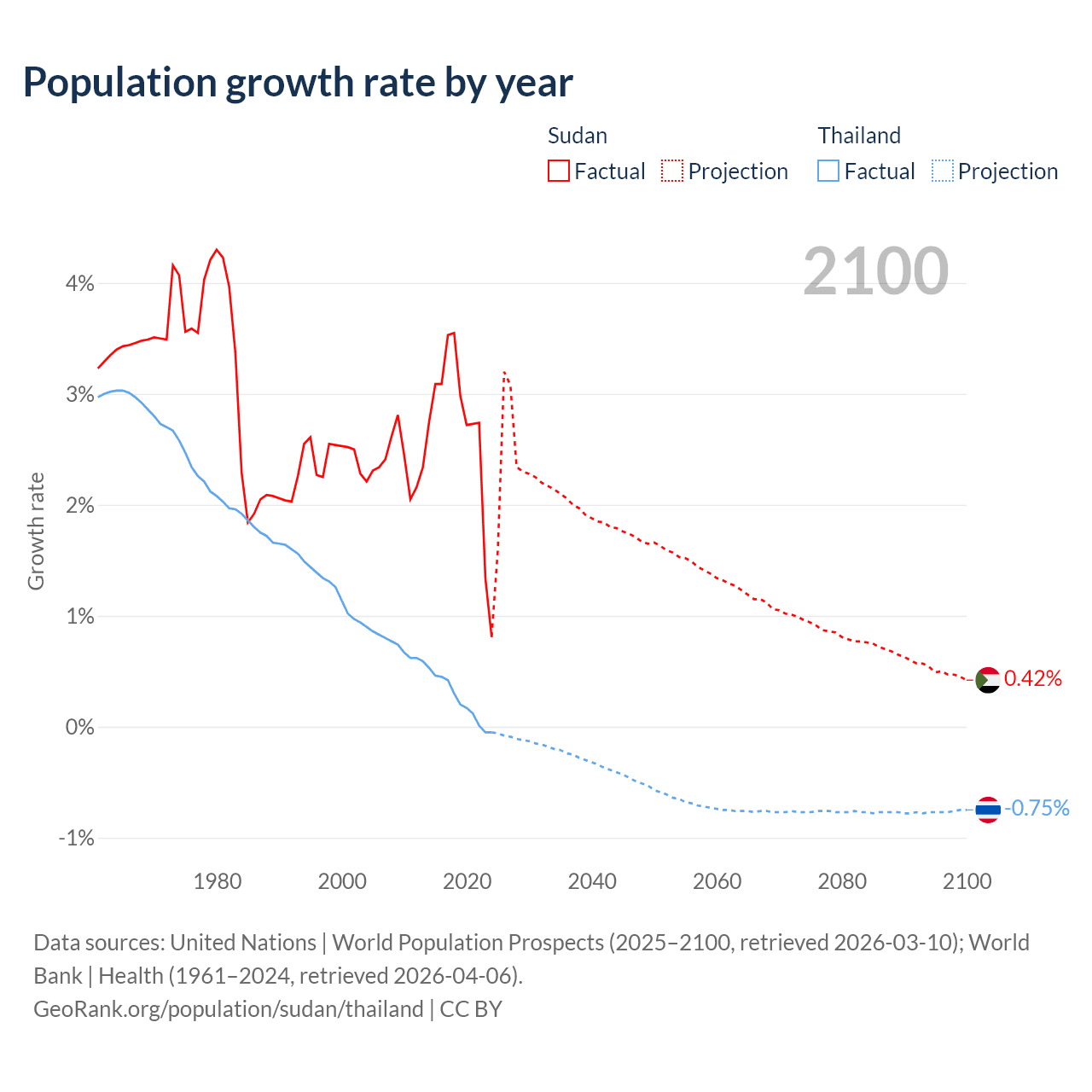 - For the last 10 years, Sudan has had an average growth rate of +2.67% per year vs +0.23% in Thailand.