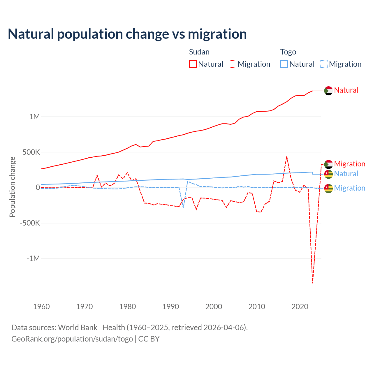 Over the last 10 years, 95.1% of the population change in Sudan is from natural causes (a gain of 12,459,977 people) and 4.88% is from migration (a loss of 639,596 people). In Togo 99.1% is from natural causes (a gain of 2,052,115 people) and 0.86% is from migration (a loss of 17,852 people).