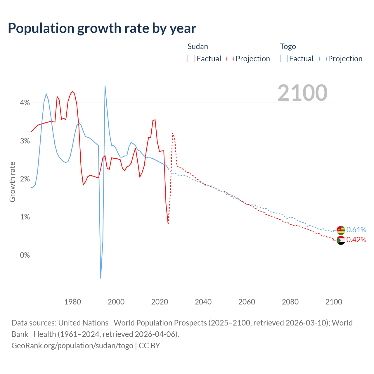 - For the last 10 years, Sudan has had an average growth rate of +2.67% per year vs +2.46% in Togo.