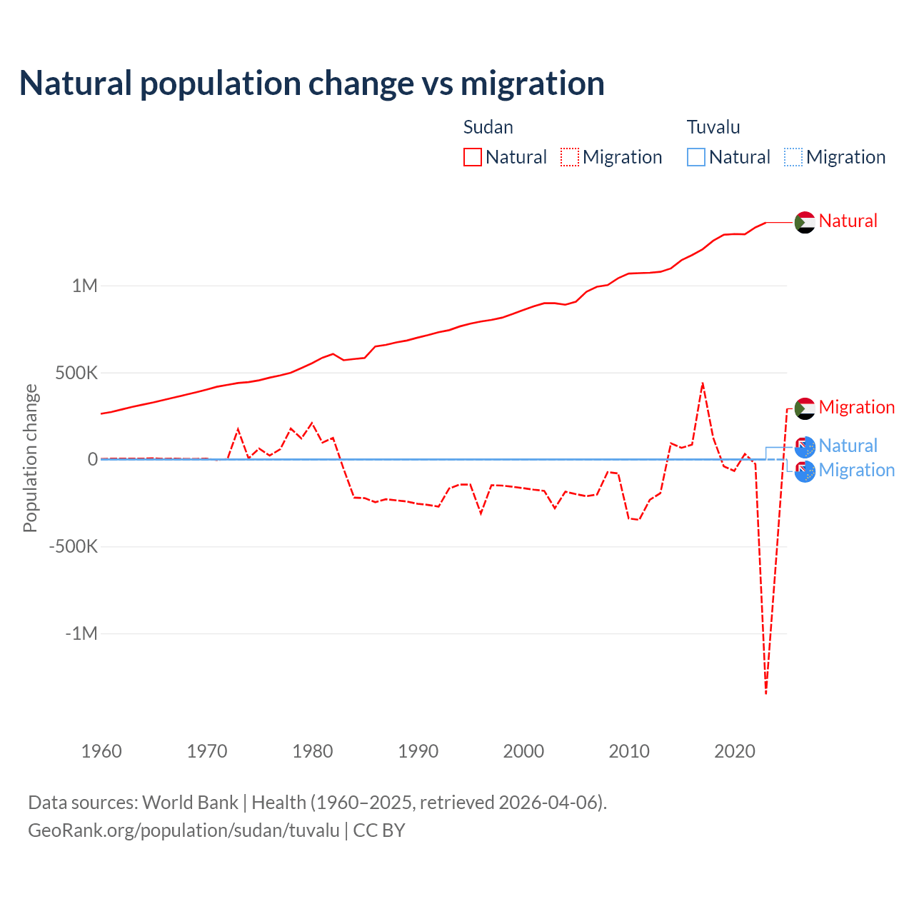 Over the last 10 years, 95.1% of the population change in Sudan is from natural causes (a gain of 12,459,977 people) and 4.88% is from migration (a loss of 639,596 people). In Tuvalu 35.5% is from natural causes (a gain of 1,556 people) and 64.5% is from migration (a loss of 2,827 people).