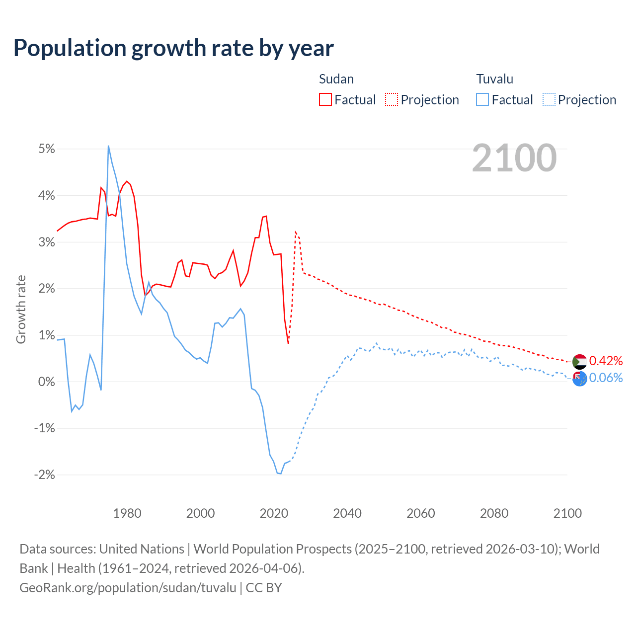 - For the last 10 years, Sudan has had an average growth rate of +2.67% per year vs -1.19% in Tuvalu.