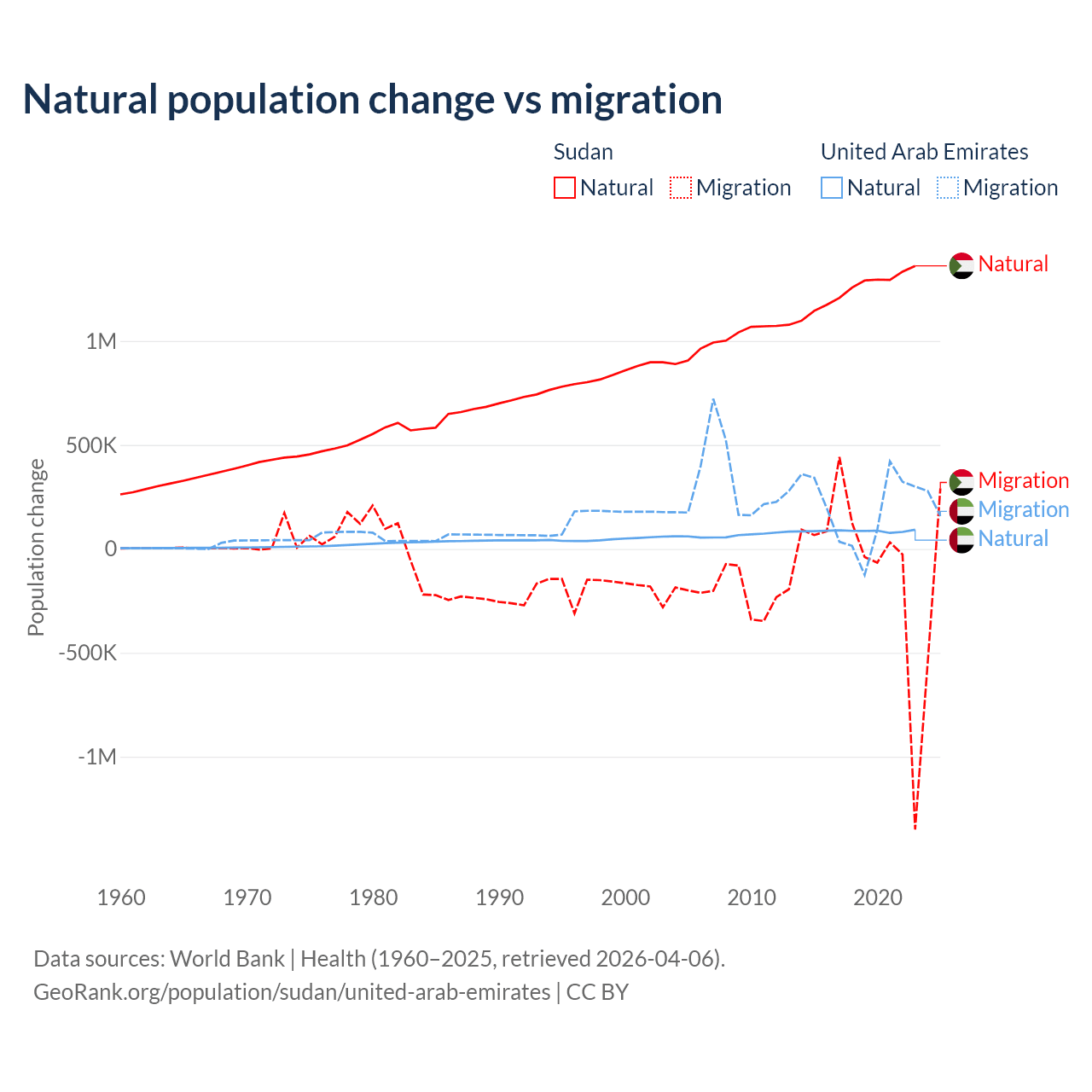 Over the last 10 years, 95.1% of the population change in Sudan is from natural causes (a gain of 12,459,977 people) and 4.88% is from migration (a loss of 639,596 people). In the United Arab Emirates 30.5% is from natural causes (a gain of 857,996 people) and 69.5% is from migration (a gain of 1,958,520 people).