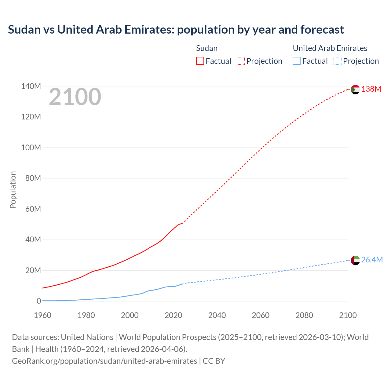 The latest officially reported population of Sudan was 50,448,963 in 2024 vs 10,986,400 people in the United Arab Emirates in 2024. In 2026, based on the adjusted UN estimation, the current Sudan's population is 53,335,233 people compared to 11,686,438 in the United Arab Emirates.