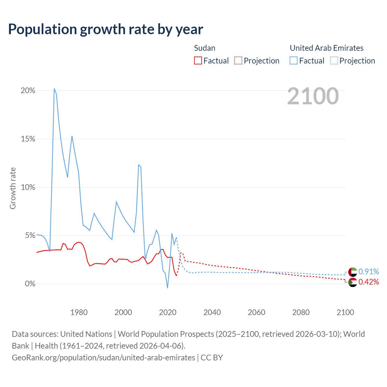 - For the last 10 years, Sudan has had an average growth rate of +2.67% per year vs +3.31% in the United Arab Emirates.