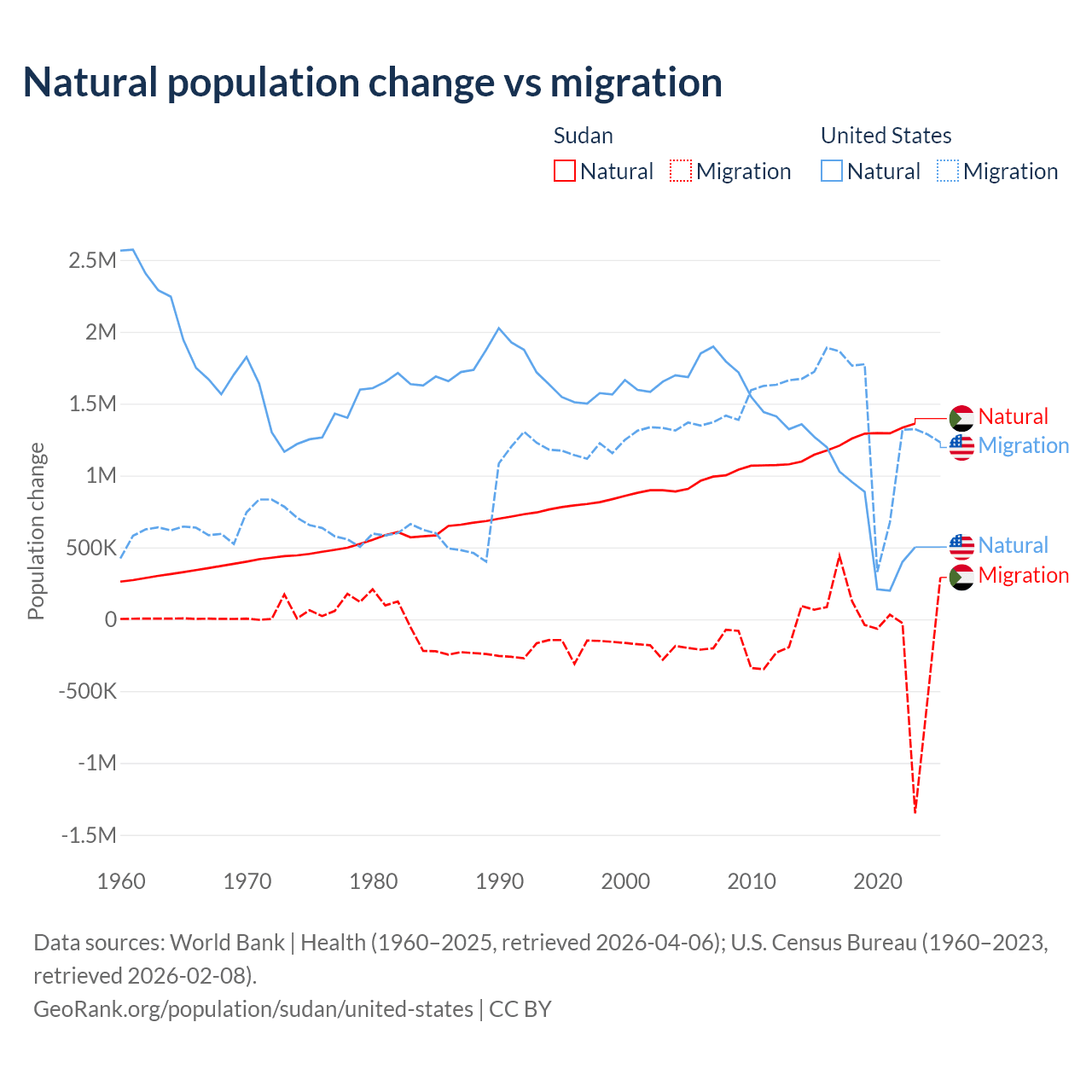 Over the last 10 years, 95.1% of the population change in Sudan is from natural causes (a gain of 12,459,977 people) and 4.88% is from migration (a loss of 639,596 people). In the United States 35.8% is from natural causes (a gain of 8,005,866 people) and 64.2% is from migration (a gain of 14,334,286 people).