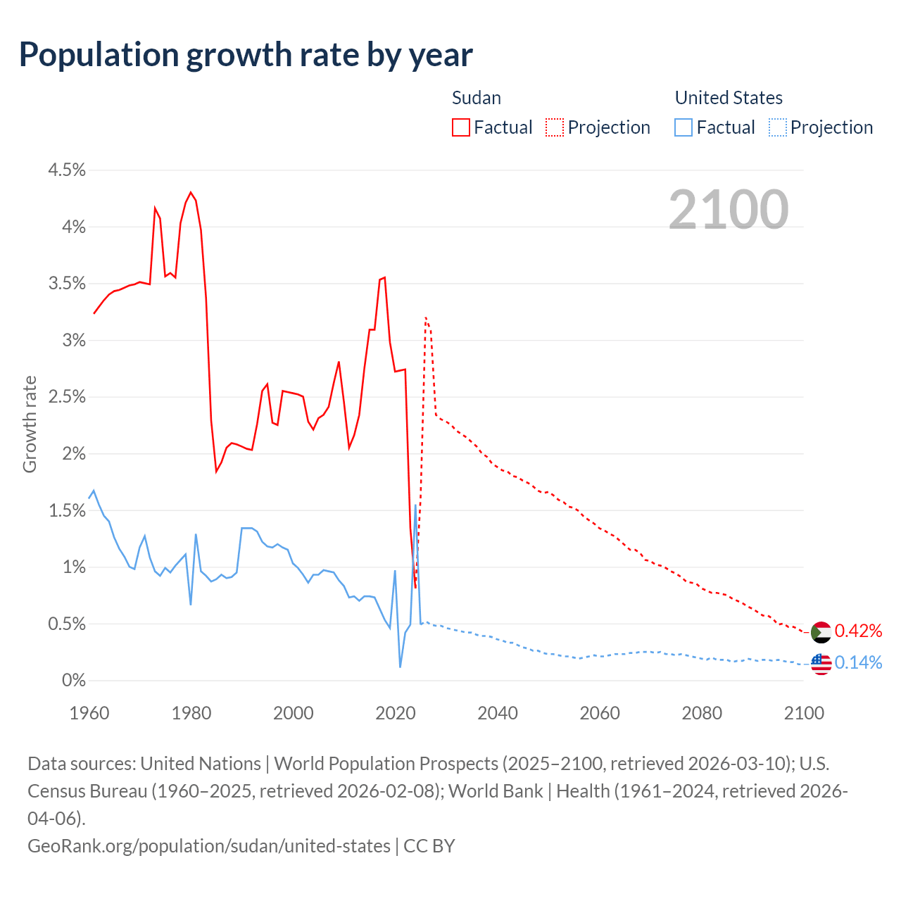 Data sources: World Bank | Health (1960–2024, retrieved 2026-04-06); United Nations | World Population Prospects (1960–2026, retrieved 2026-03-10); U.S. Census Bureau (1960–2025, retrieved 2026-02-08); Central Intelligence Agency (CIA) (2000–2019, retrieved 2026-02-20).