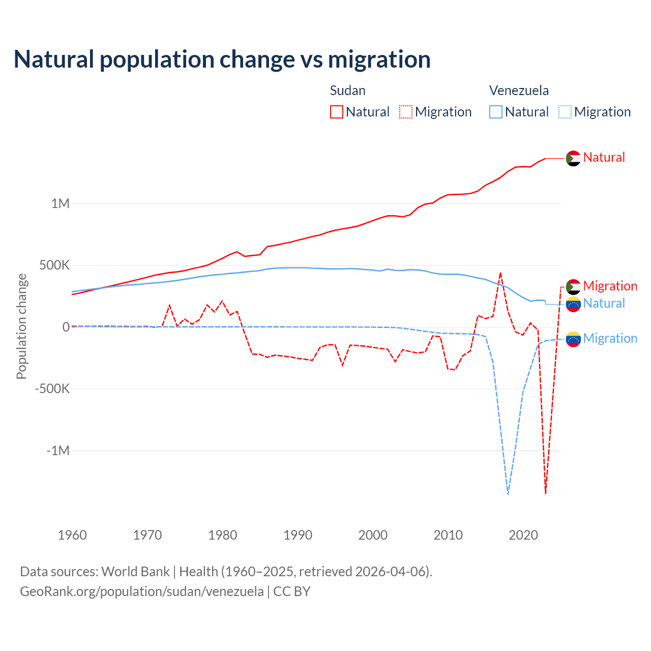 Over the last 10 years, 95.1% of the population change in Sudan is from natural causes (a gain of 12,459,977 people) and 4.88% is from migration (a loss of 639,596 people). In Venezuela 38.6% is from natural causes (a gain of 2,946,257 people) and 61.4% is from migration (a loss of 4,683,227 people).