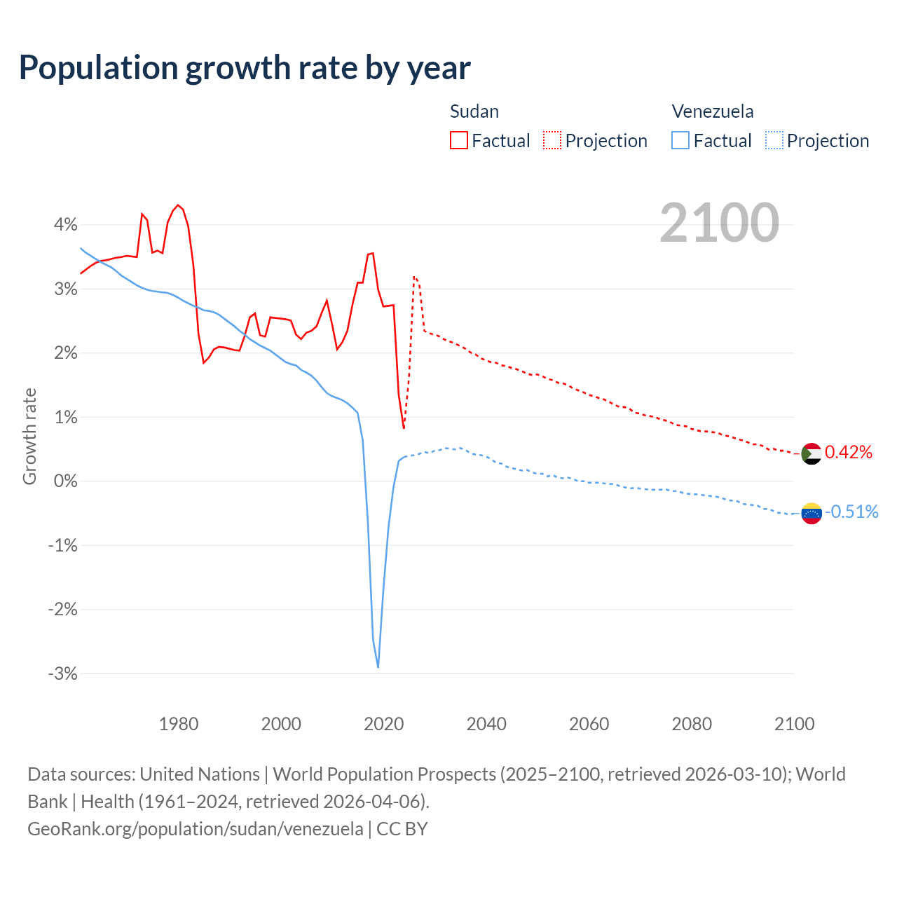- For the last 10 years, Sudan has had an average growth rate of +2.67% per year vs -0.46% in Venezuela.